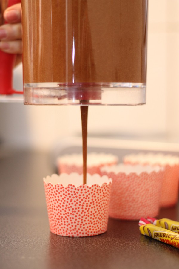 - Sortez les moelleux du four (laissez-les un peu refroidir) et à l’aide d’une poche à douille ajoutez votre préparation aux carambars au centre
